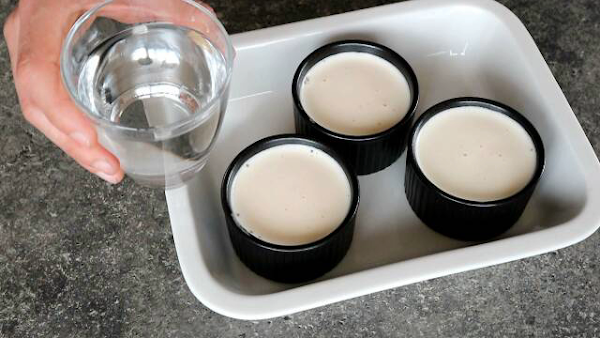 6º Una vez lo tengamos vamos a repartir la mezcla en cuencos con la ayuda de un cazo, una vez repartido los colocamos en una bandeja con un dedo de agua para hacer el baño Maria. Los horneamos a 160º durante 30 minutos.