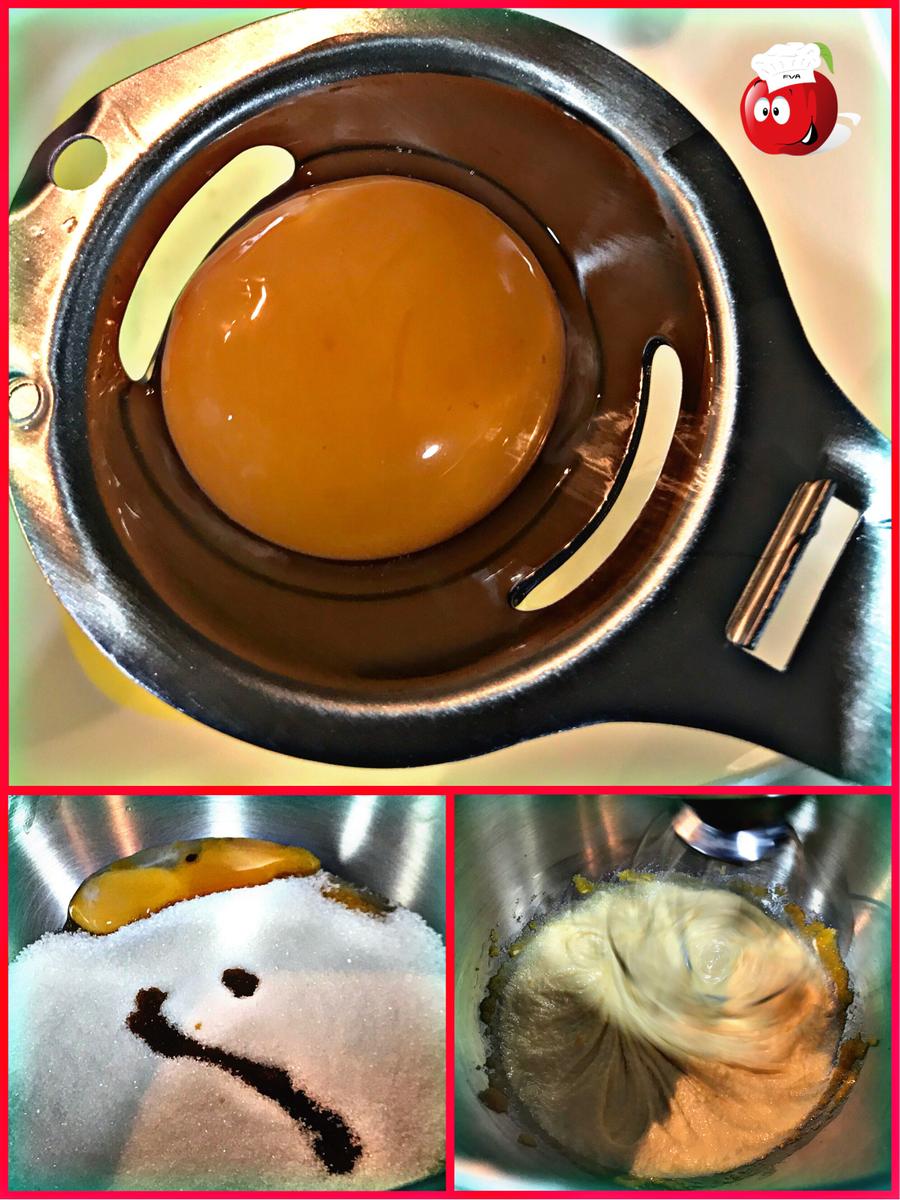 Agregamos la nata (crema de leche), los huevos, el azúcar y la esencia de vainilla y removemos bien con un batidor manual (yo lo hice con la kitchenaid)