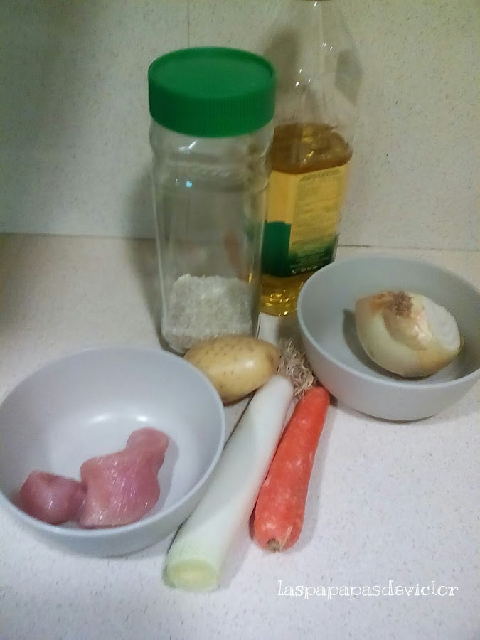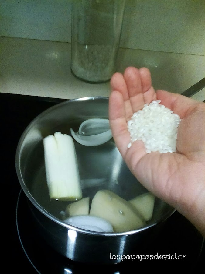 En un cazo poner agua e incorporar: el arroz, la cebolla, el puerto y la patata