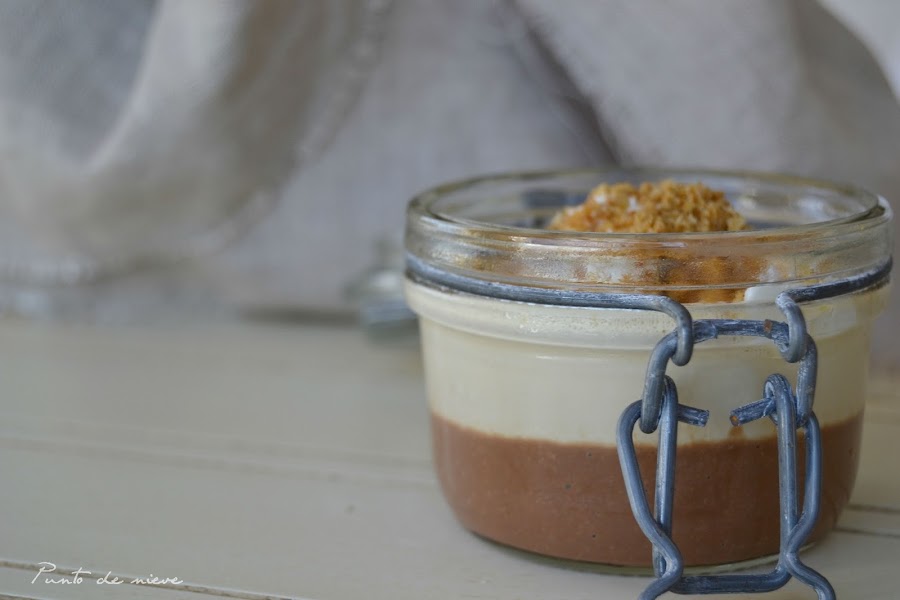 Preparación: Vertemos el cremoso de chocolate en el recipiente de presentación y refrigeramos de 2 a 3 horas. A continuación añadimos el cremoso de café y reservamos.
