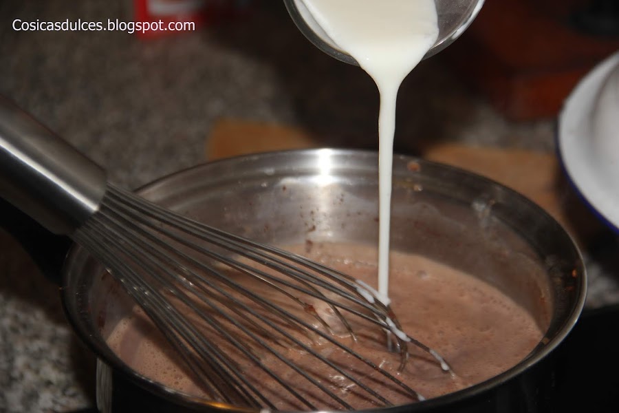 Una vez tengamos el chocolate bien disuelto, añadimos la cuajada que habremos disuelto en los 50 mililitros de leche restantes. Volvemos a poner al fuego y llevamos a ebullición.