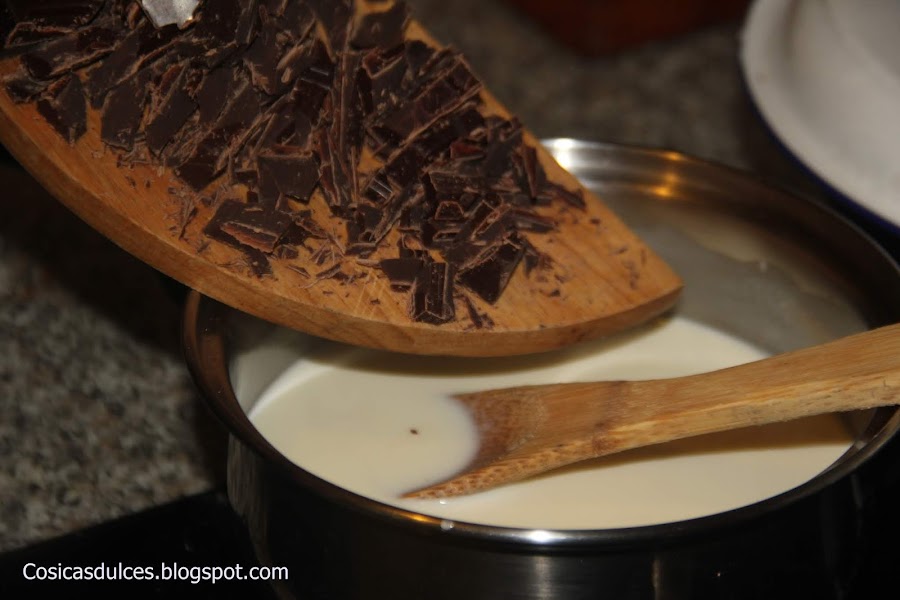 Ponemos a hervir la nata (crema de leche), 250 mililitros de leche y el azúcar. cuando rompa a hervir añadimos el chocolate picado.