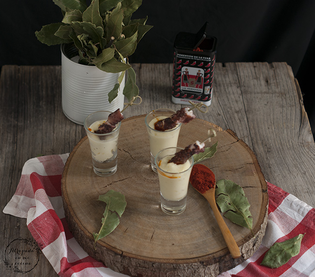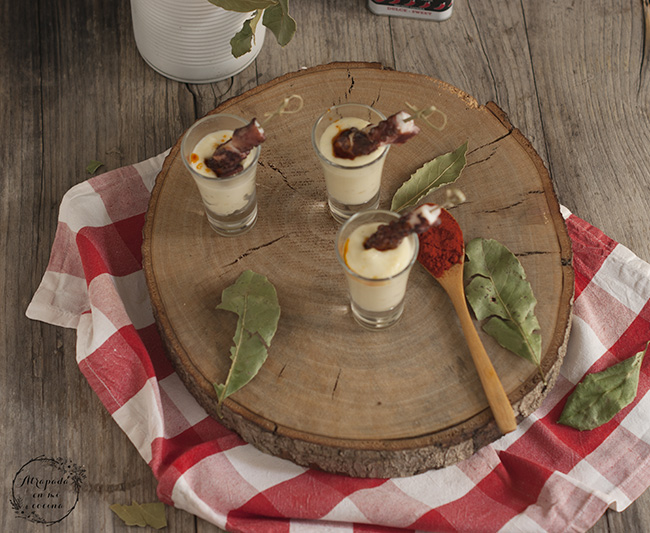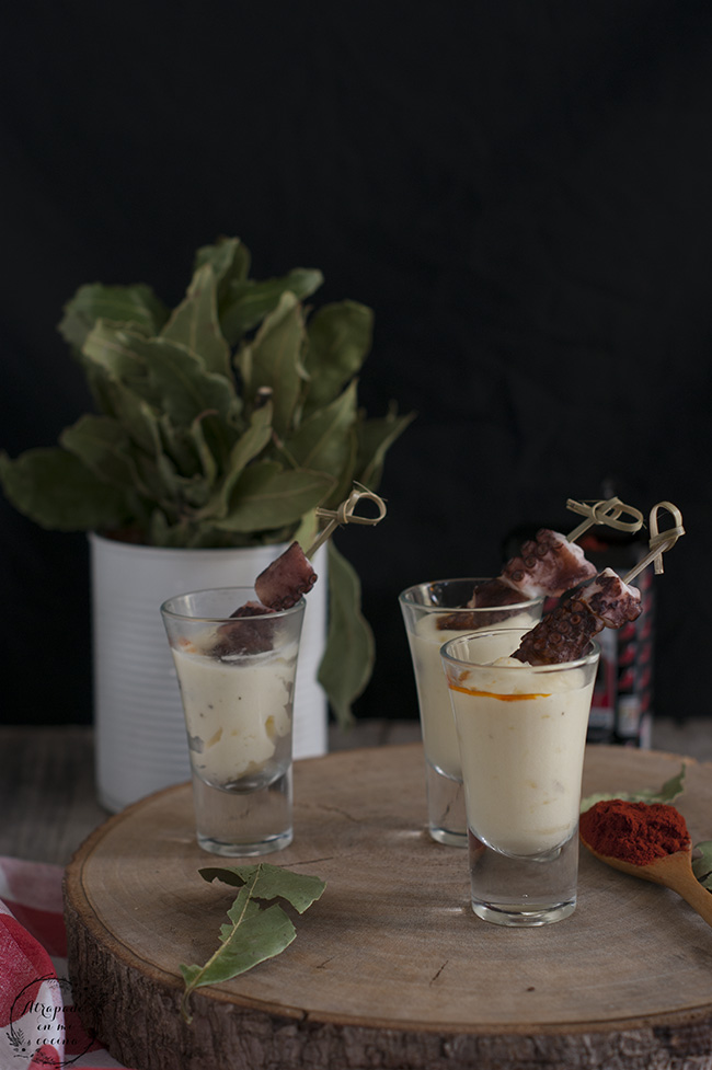 Aunque mi primera opción ha sido presentarlo en vasitos en forma de aperitivos, para convertirlo en plato único pondremos sobre un plato un fondo de cremoso de patata y añadimos el pulpo sin brocheta, en tacos. Estará igual de bueno desde luego.
