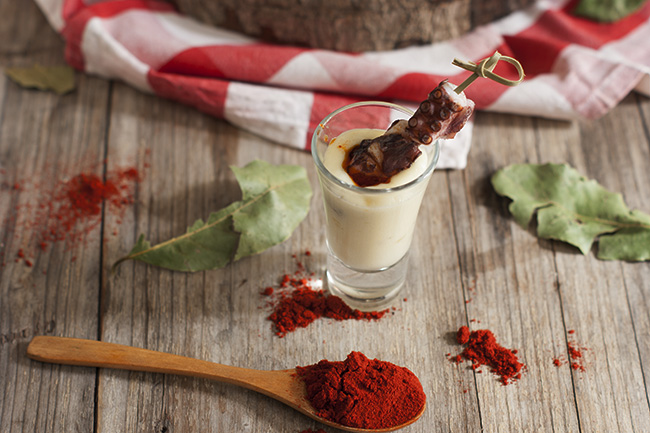 Cortamos el pulpo en tacos, pinchamos en una brocheta, disponemos el cremoso de pulpo en vasitos (lo he metido en una manga pastelera para echarlo con más comodidad) o también en el fondo de un plato. Colocamos la brocheta de pulpo. Calentamos un poco de aceite de oliva virgen junto con el pimentón y rociamos el pulpo con él. Completamos con un poco del flor de sal y servimos.