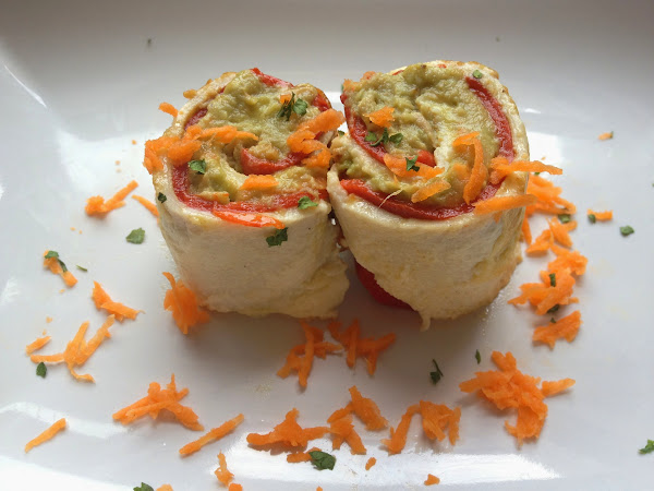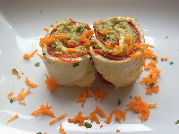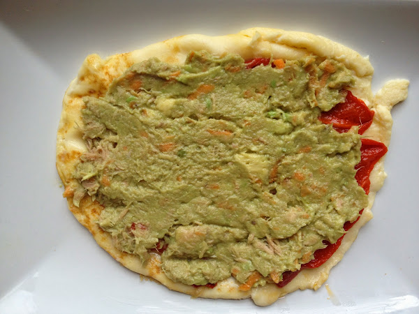 8 Sobre el pimiento de Piquillo, extenderemos una buena cantidad de la mezcla que tenemos de aguacate, cubriendo todo el crep.
