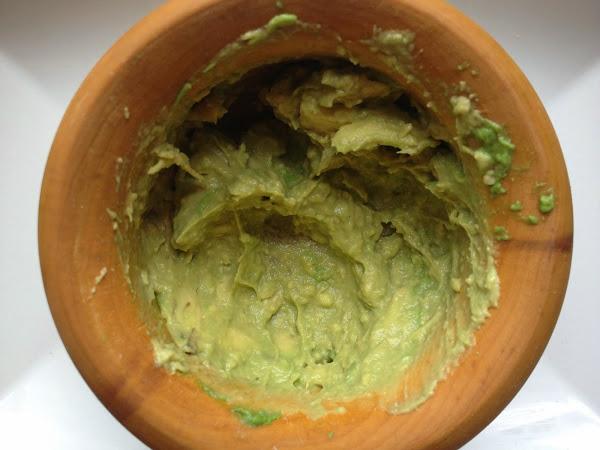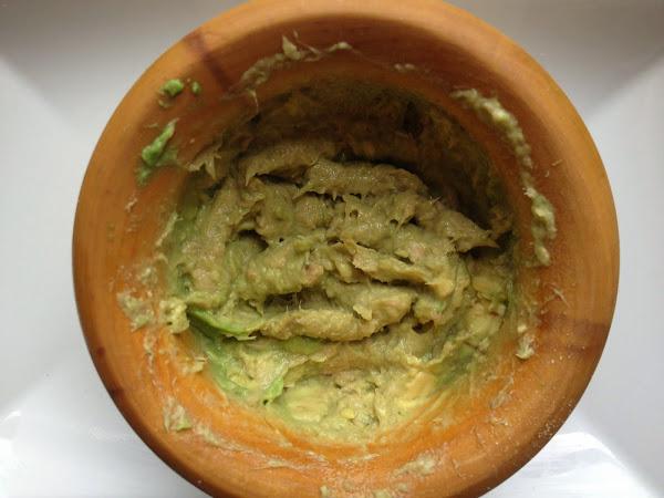 Abrimos los aguacates por la mitad y sacamos su carne con la ayuda de una cuchara, añadimos esta carne a un mortero y la machacamos formando una pasta.