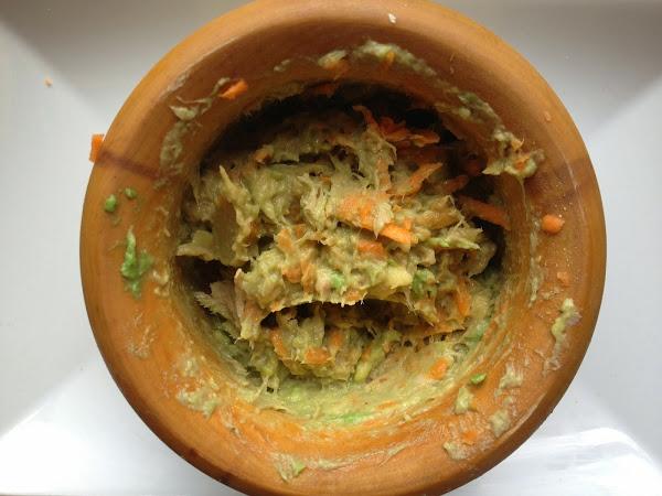 5 Con la ayuda de un pelador,eliminamos la piel de una zanahoria y con un raspador incorporamos esta zanahoria a la mezcla que tenemos de aguacate y atún.