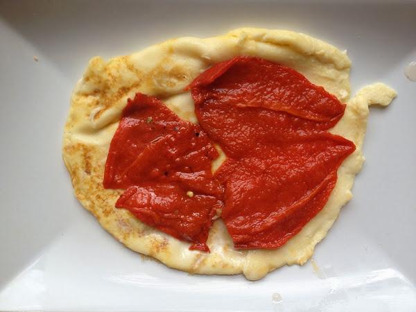 7 Sacamos del bote un pimiento del Piquillo, lo abrimos eliminando sus pepitas y lo añadiremos sobre el crep que tenemos preparado en un plato, cubriendo bien el crep .