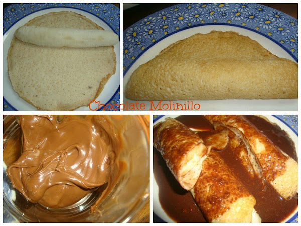 Son muy simples, colocamos una crepa en un plato y le agregamos una rebanada de plátano, en realidad yo lo parto a la mitad por lo largo y coloco una mitad en cada crepa; la salsa de chocolate la pueden preparar con nutella mezclada con leche, solamente la calientan en el micro y la mezclan bien.