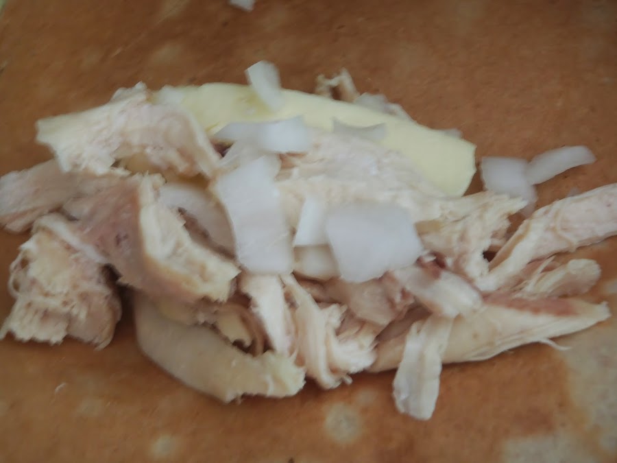 Haga su picado de pollo agregue 2 onzas de pollo, una lasca de queso y 1/4 de cucharadita de cebolla a cada tortilla. Enrollelas y tengalas preparadas para ponerlas a hervir durante 2 minutos en la salsa.