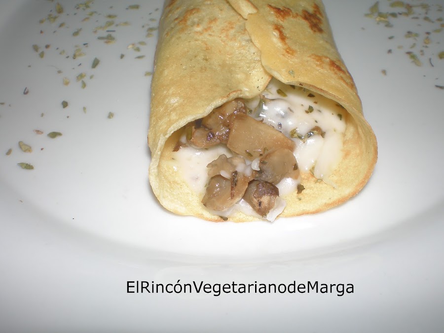 En una sartén ponemos un poco de margarina y mientras se funde, cortamos los champiñones a trozos pequeñitos, los añadimos a la sartén y los doramos. Rompemos la bola de mozzarella y la incorporamos a la sartén de los champiñones. Paramos el fuego y la dejamos fundir con el calor que queda en la sartén. Añadimos sal y orégano y rellenamos las crêpes.