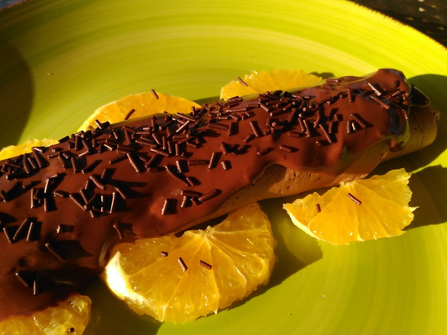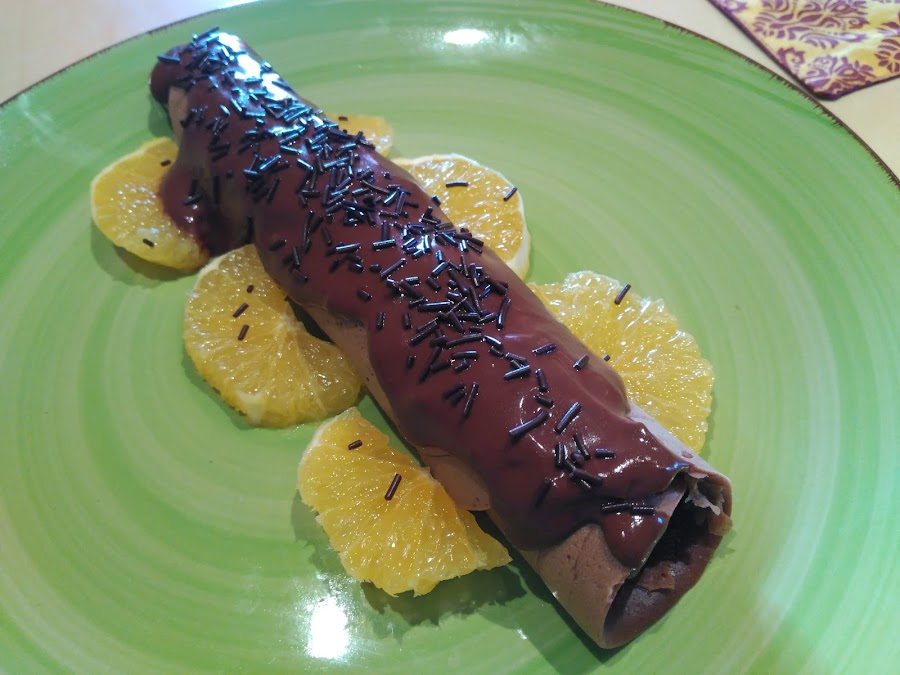 No se le puede pedir más a una crêpe, doble de chocolate y con un sabor intenso a chocolate, a naranja, a vainilla...ummmm deliciosa esta recetaza de Darío Barrio. D.E.P.