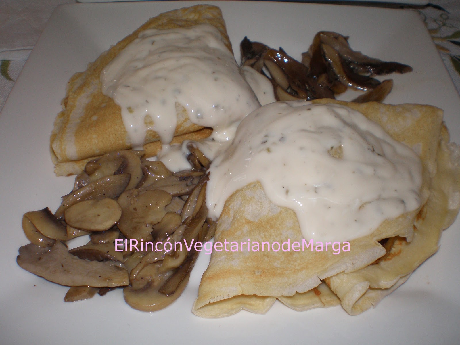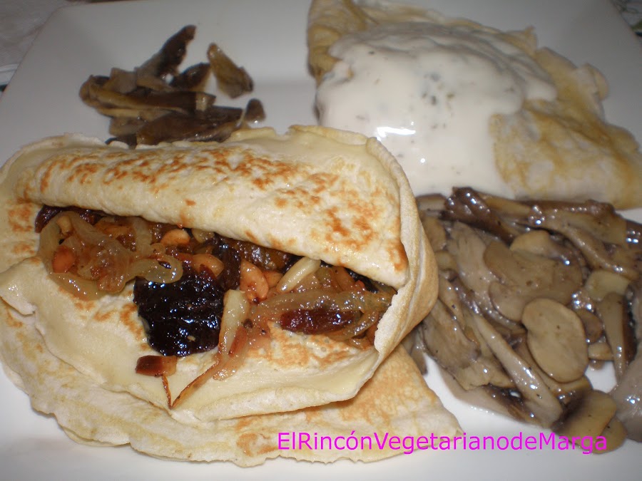 En el centro de la masa de crêpe ponemos como relleno los frutos secos y la cebolla y lo cerramos por la mitad. Servimos con las setas y con la salsa de yogur por encima.