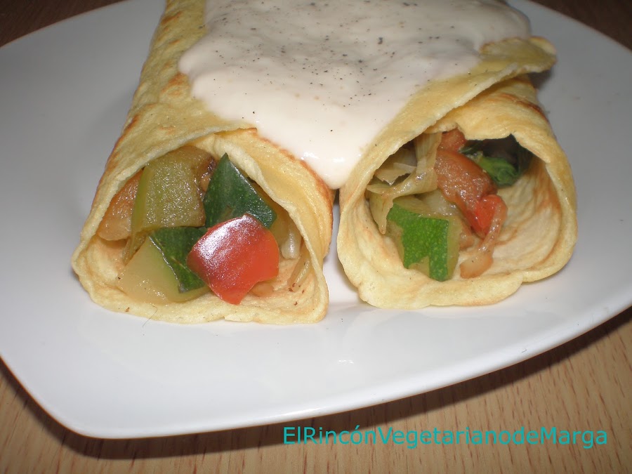 Ponemos las verduras cocidas en el interior de la crêpe y lo enrollamos. Añadimos por encima la bechamel. Riquísimo!! Para un primer plato está bien.