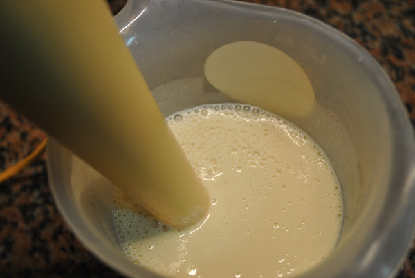 Introducimos todos los ingredientes en un vaso batidor, dejando para el ultimo momento la leche, lo que nos facilitará su licuado.