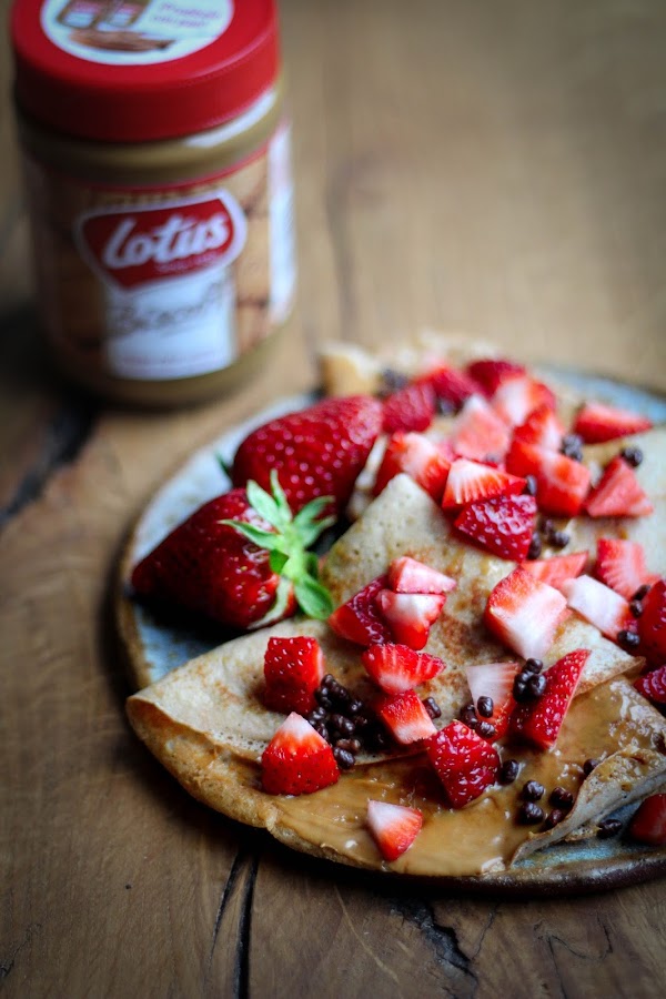 Finalemente rellenamos de nuestro ingrediente preferido, la crema de Lotus, con sabor a galleta caramelizada. Troceamos unas fresas y las distribuimos por encima junto con unos crunch de chocolate negro.