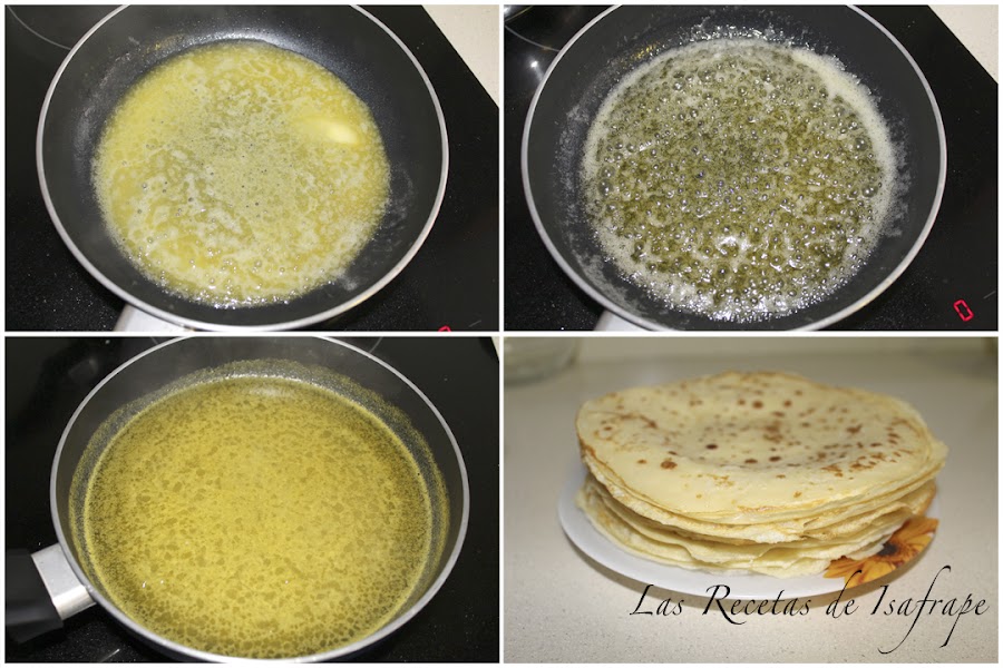 3.-Ya tenemos los crepes reservados en el plato, ahora vamos a preparar la salsa. En la misma sartén donde hemos hecho los crepes, ponemos la mantequilla y una vez fundida añadimos el azúcar.