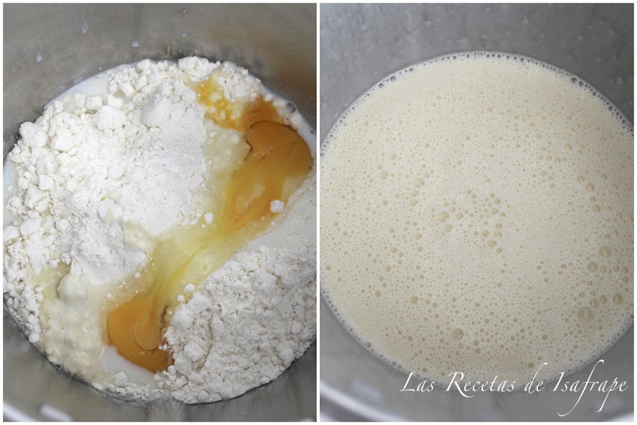 1.-Comenzamos preparando los crepes. Con ayuda de una batidora o unas varillas eléctricas batimos la harina, los huevos, la leche y la sal. Guardamos la mezcla en la nevera durante una hora aproximadamente para que repose.