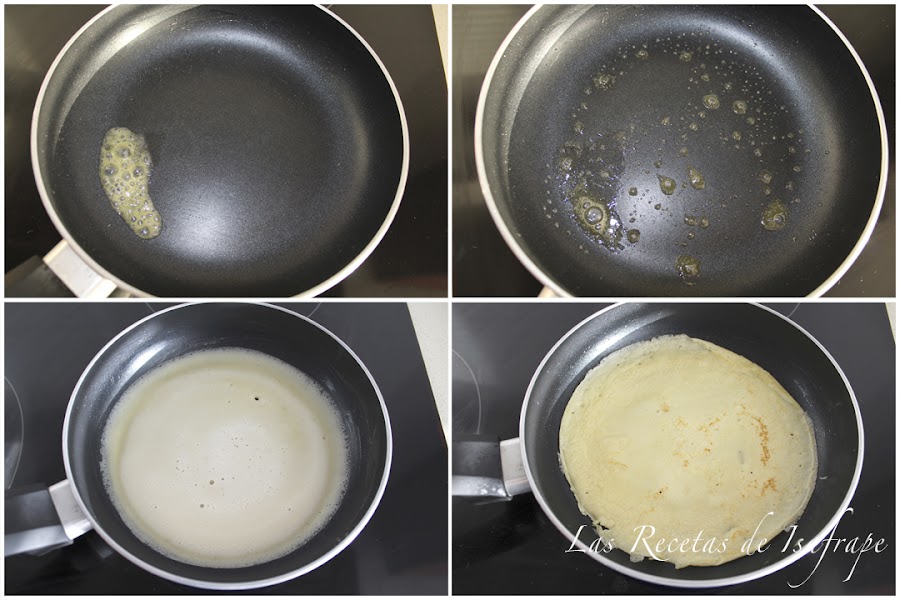 2.-Ponemos una sartén antiadherente al fuego, la untamos con mantequilla y vertemos un cucharón de masa, repartiéndola por toda la superficie. Cuando veamos que el crepe está hecho por abajo, le damos la vuelta para que se haga por la otra parte. Una vez hecho, lo depositamos sobre un plato. Repetimos la operación hasta terminar con la masa.