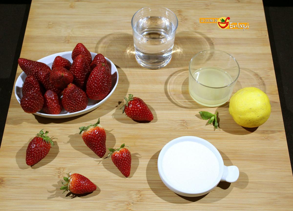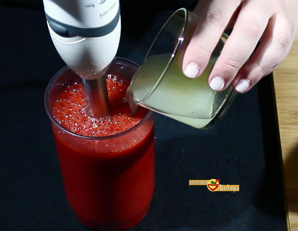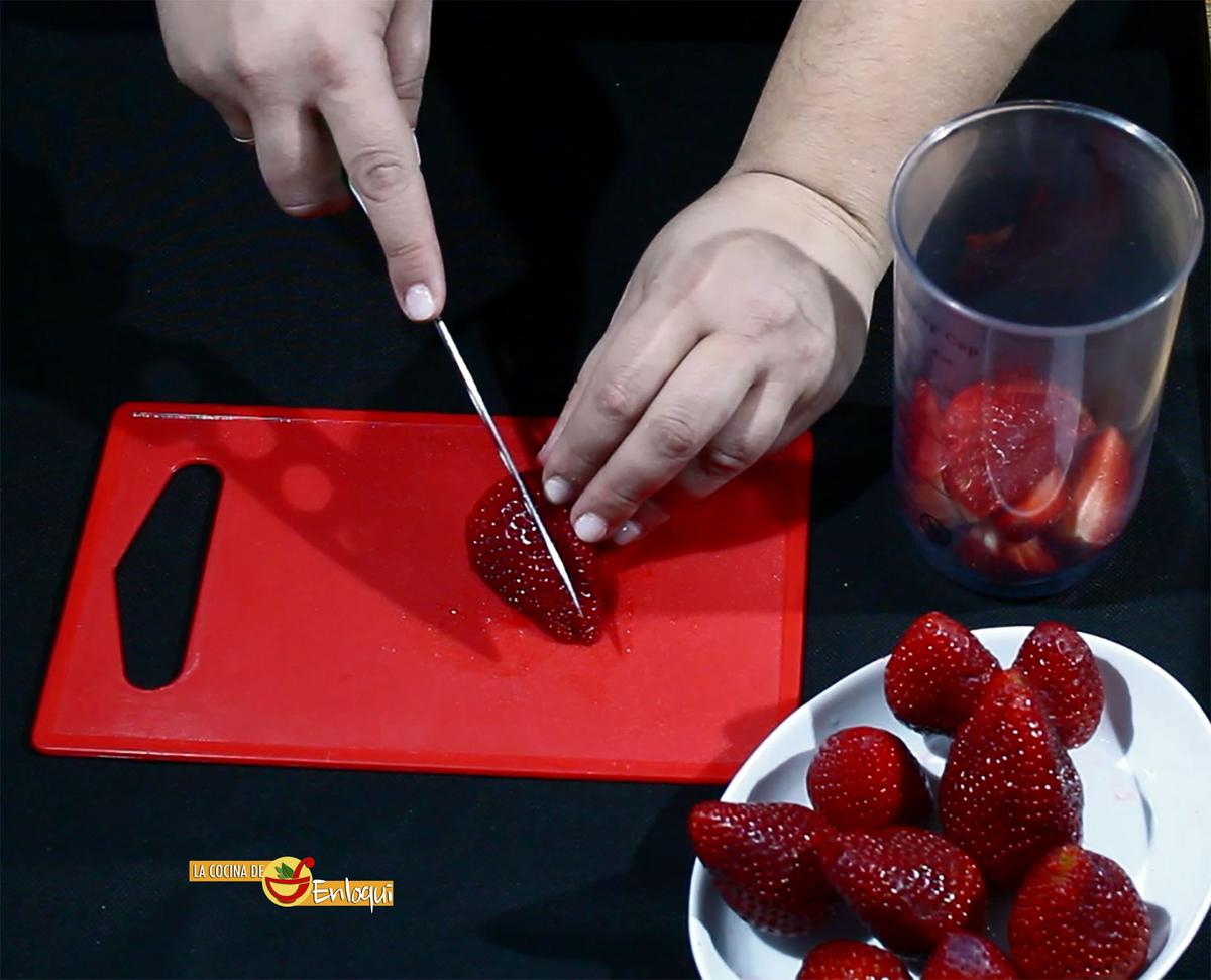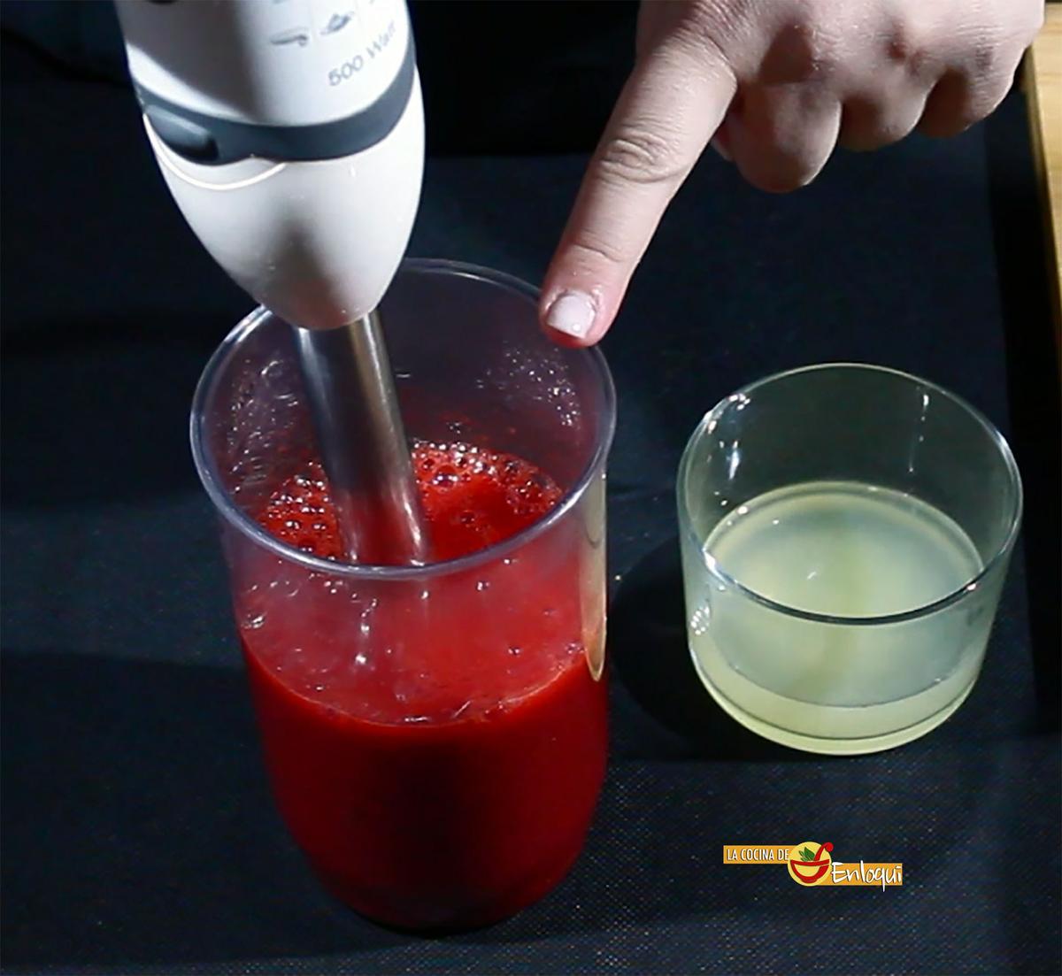 Mientras tanto prepara las fresas. Lávalas y retira las hojas verdes. Ponlas en el vaso de la batidora y tritura hasta que queden bien licuadas. A continuación añade el jarabe que hemos preparado antes junto con un chorrito de zumo de limón y bátelo todo.