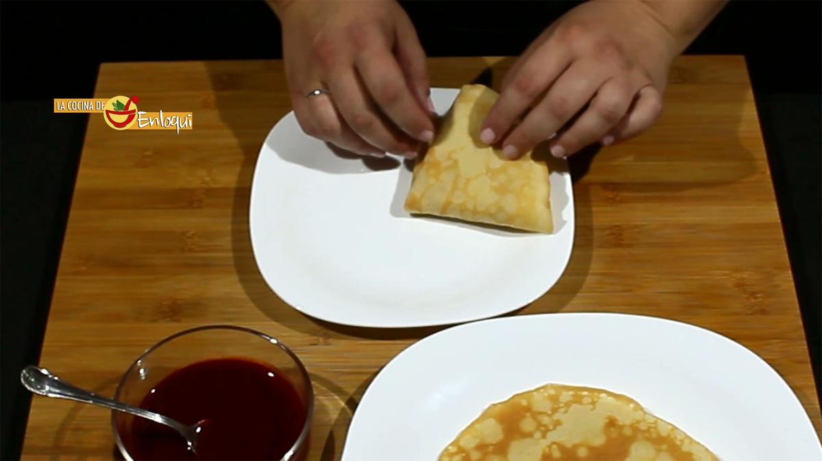 Ya sólo nos queda servir las crepes y decorarlas. Las puedes doblar en cuartos, es decir, dobla por la mitad y de nuevo por la mitad. Colócalas en el plato o bandeja donde las vas a servir.