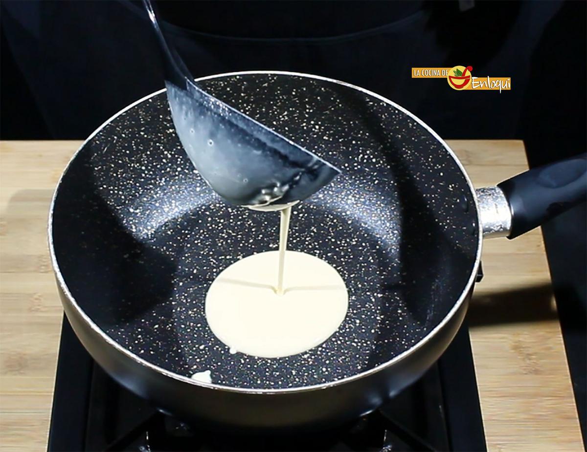 Ahora pon una sartén antiadherente al fuego y pinta la superficie con un poco de mantequilla. Vierte en ella, con la ayuda de un cazo o cucharón, un poco de masa. Inclina la sartén, si es necesario para que la masa quede bien repartida por toda la superficie y deja hacer por una cara. Cuando esté bien dorada da la vuelta y deja dorar por la otra.