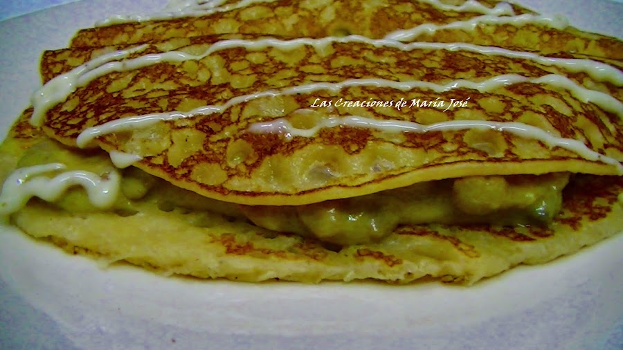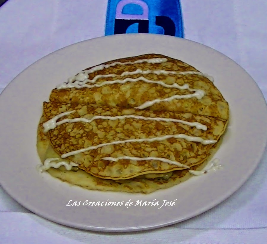Se saltean los champiñones en una sartén con un poco de aceite de oliva. Cuando estén se echa una cucharada de harina, remover bien y echar un vaso de leche, una pizca de pimienta, ajo en polvo, cebolla en polvo, sal y una pizca de curcuma. Remover bien, se tiene que quedar una salsa un poco espesa, como si fuera para croquetas. Cuando este hecho rellenar los crepes y servir bien calentito. Yo le eche por encima un poco de salsa de roquefort que tenia.