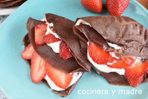 Dificultad: muy fácil Raciones: 6 – 8 unidades Tiempo: 15 minutosIngredientes de los crepes de chocolate con fresas y nata (crema de leche):