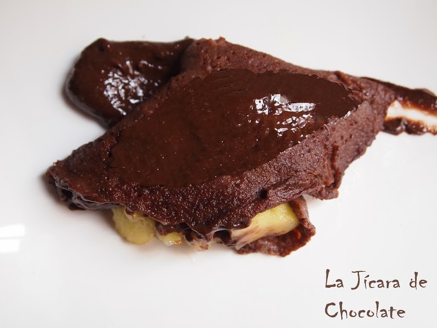 8. Rellenamos cada crepe con un poco de crema de chocolate y fruta caramelizada, lo cerramos y le ponemos más crema de chocolate por encima.