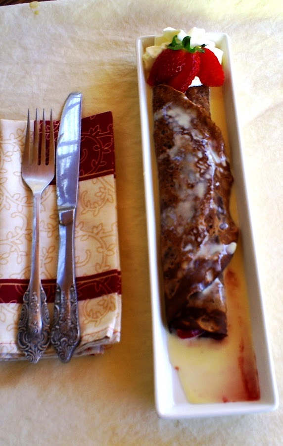 Coger las crepes y rellenarla con el preparado de las fresas, enrollarla o doblarla a su gusto. Verter por encima la salsa de chocolate blanco, decorar y servir.