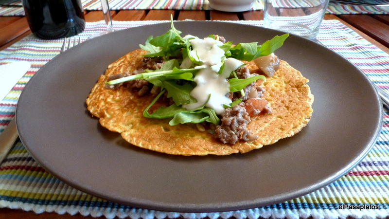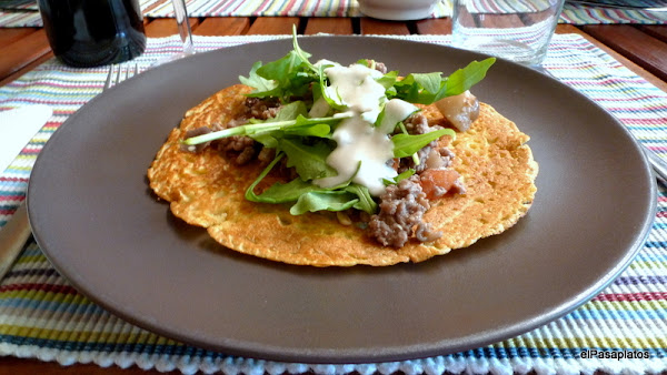 Presentamos a la mesa un cuenco con la carne preparada, otro con la salsa de yogur, una fuente con rúcula (o similar) y el plato con los crêpes para que los comensales se los preparen a su gusto.