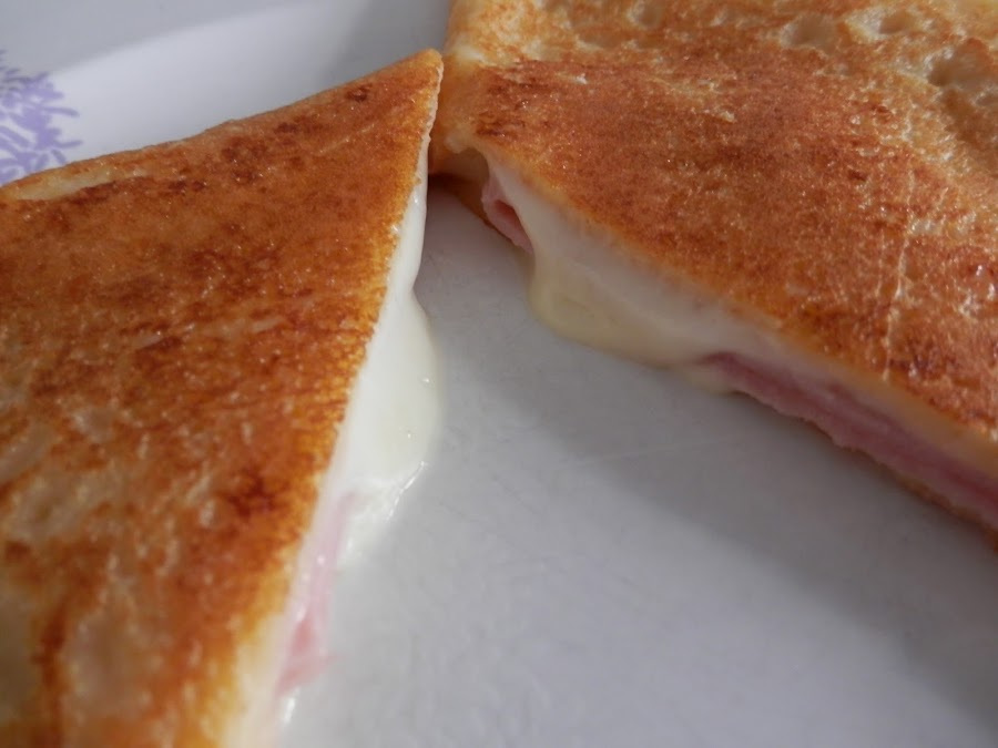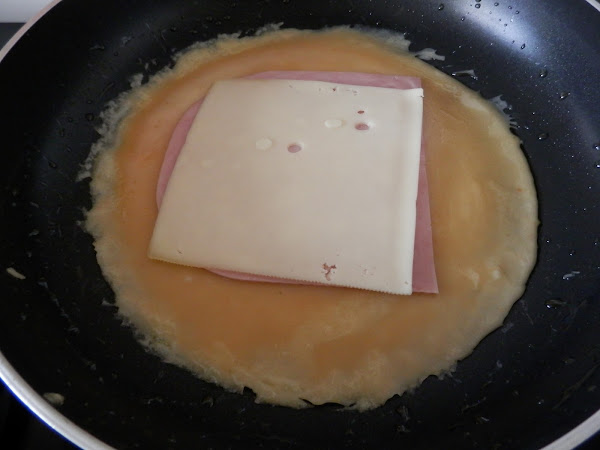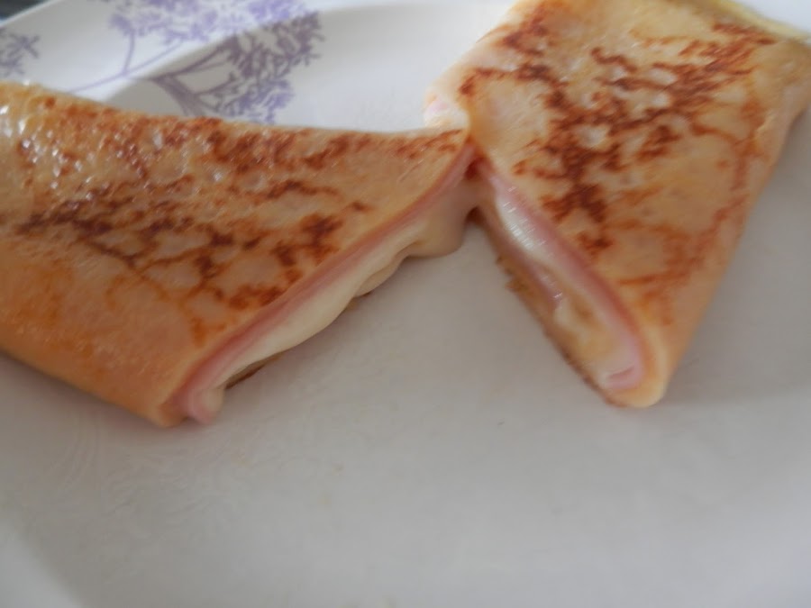 Pon encima el jamón york y el queso y envuelve alrededor con el resto de la masa, hay muchas formas de hacer los crêpes, los puedes enrollar en tres veces o los puedes plegar como si fuera una tortilla frances, de las dos maneras quedan bien.