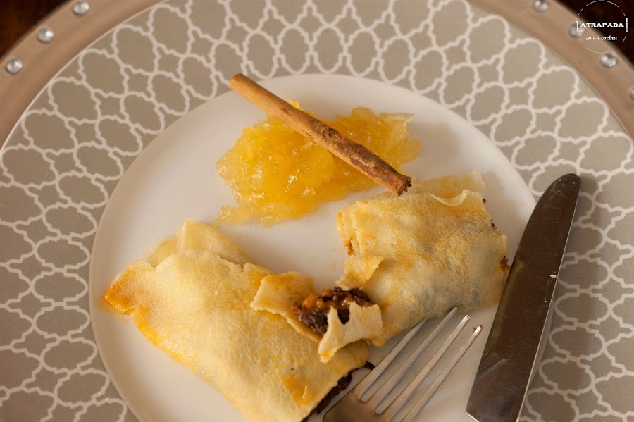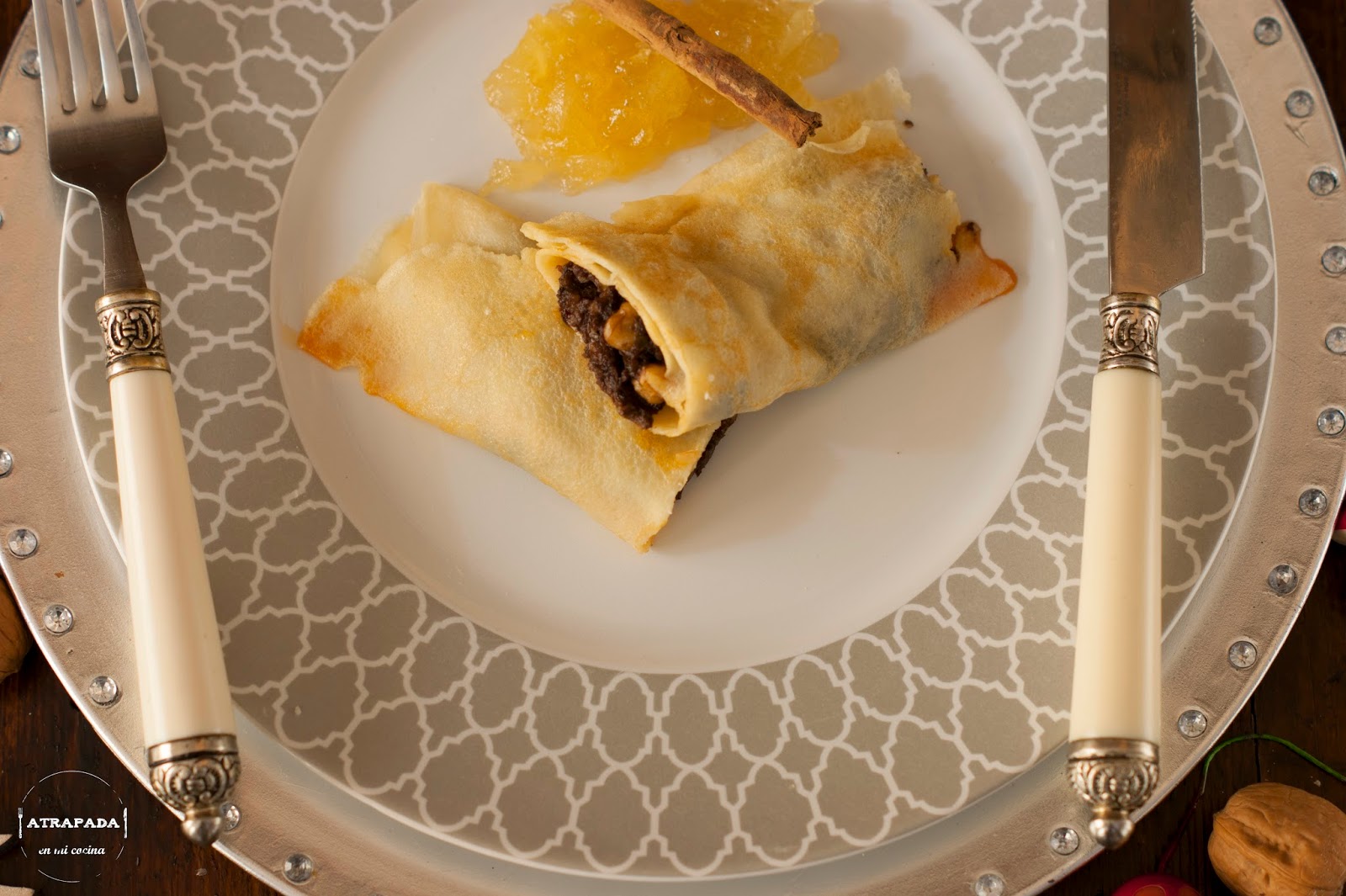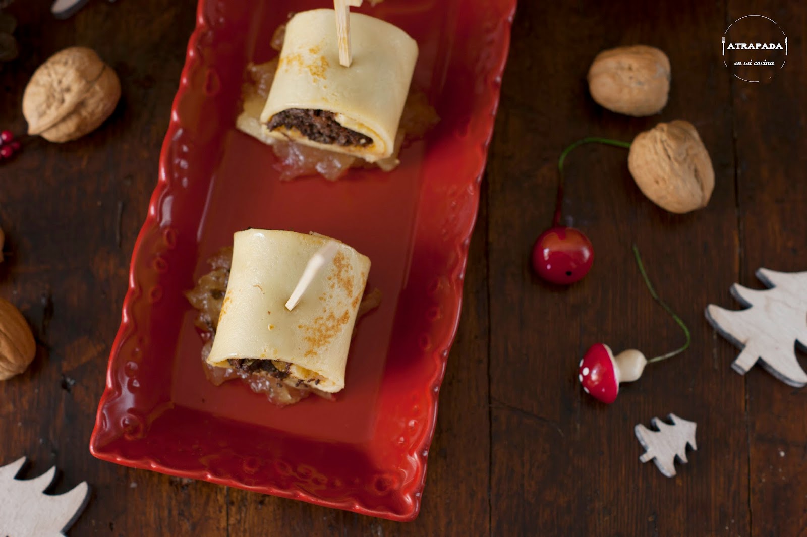 Seguimos preparando la mesa para Navidad, esta vez se me ha ocurrido sobre la marcha este aperitivo o entrante y ha resultado ser una combinación espectacular. Y si además tenemos en cuenta que las morcillas son las mismas que pude ver in situ como se preparaban en una matanza a la que me invitaron en el puente, pues mucho más cariño le tengo al plato. "Del cerdo se comen hasta los andares". La pena es que sólo pude estar presente en la matanza durante unas horas, y lo único que vi fue la preparación de la morcilla y poco más. Es una tradición y una fiesta la matanza del cerdo, donde se aglutinan familiares y amigos para repartir la difícil tarea de aprovechar hasta los andares del cerdo. Mandil en mano me puse a afeitar literalmente las pieles del marrano, después pude embutir alguna de estas morcillas. Todo me pareció una experiencia extraordinaria y espero poder asistir a una matanza desde el inicio hasta el final. Aunque parezca algo rudo y muy alejado de la alta cocina, de la matanza podemos sacar ingredientes con los que preparar platos de lujo. Y es que estas morcillas dentro de los crepes son un muy digno ejemplo de ello. Son de las mejorcitas que he probado en mi vida, cebolla, mucha, grasa del animal, su propia sangre, comino, canela, arroz, orégano, semillas de pimientos secos, pimienta, pimentón.....no se si se me olvida algún ingrediente...pero mucho fundamento y mucha práctica en la elaboración de las mismas las convierten en todo un manjar.