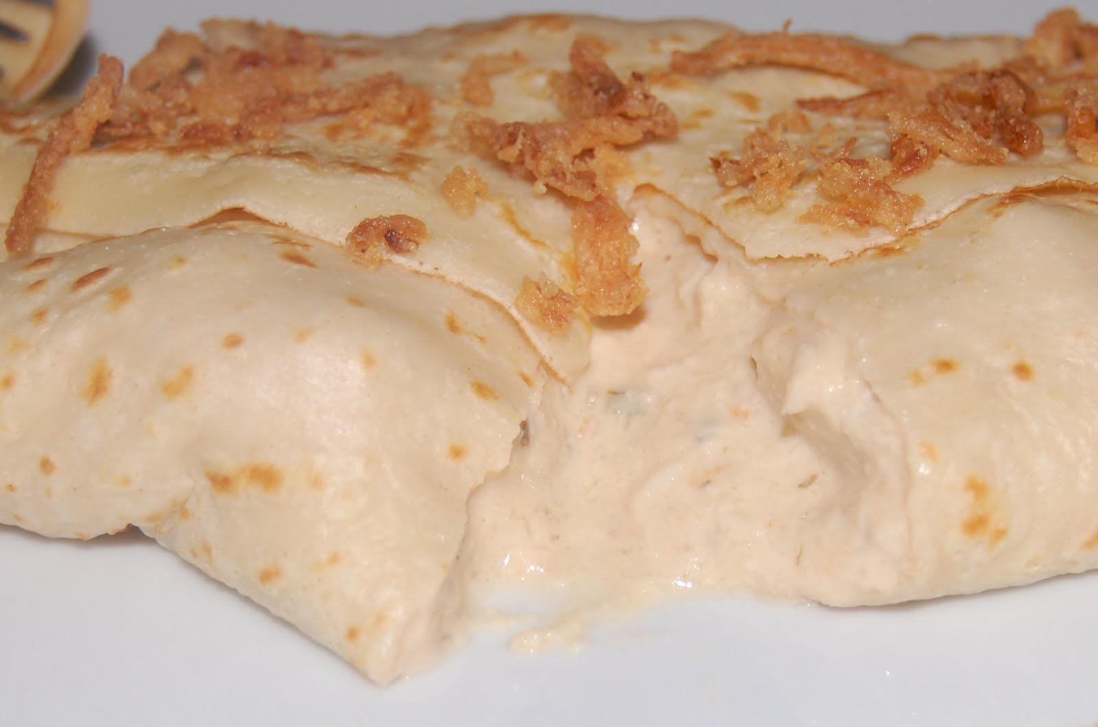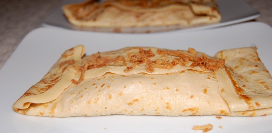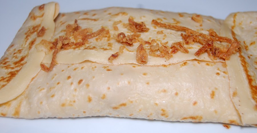 Rellenamos los crepes con la salsa y ponemos por encima la cebolla frita para ensaladas o hot dogs