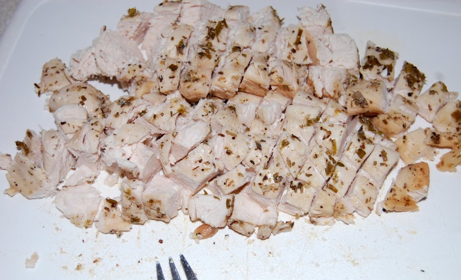 Troceamos las pechugas en dados y la introducimos en la olla junto a la salsa.