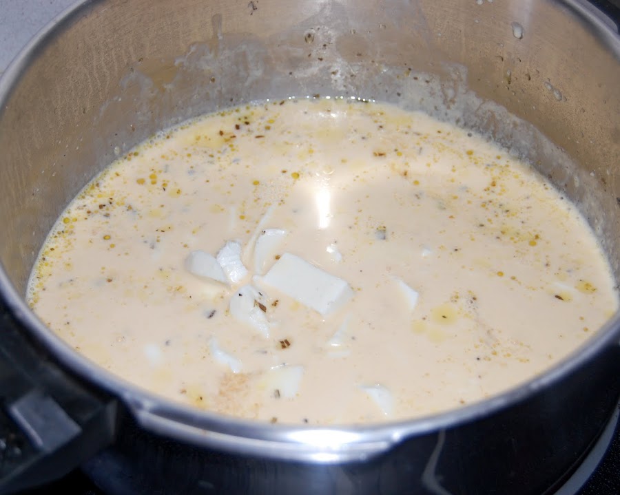 Sacamos las pechugas y a la salsa que queda en la olla le añadimos la mozarella y el brick de leche evaporada, calentamos hasta que se funda el queso.