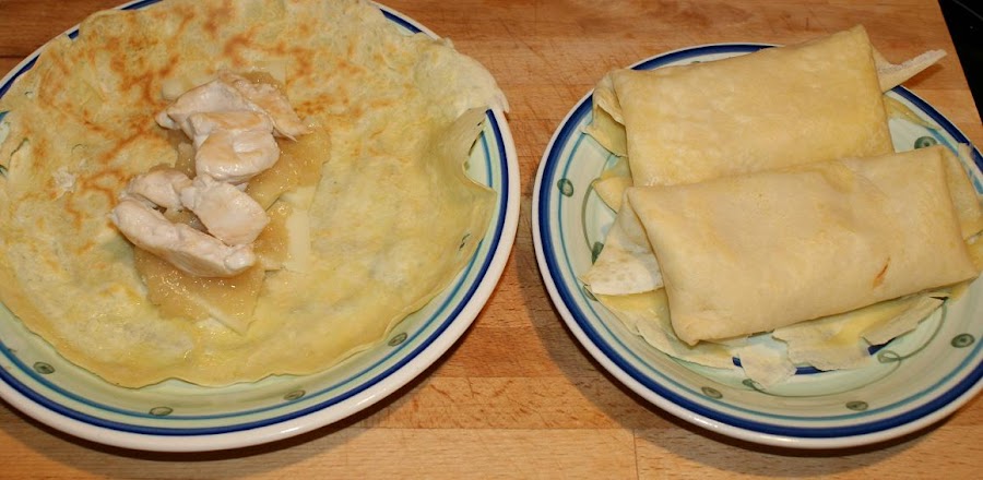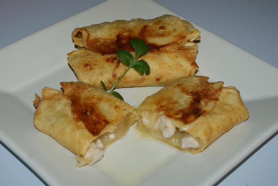 Cuando el pollo este dorado lo sacamos y lo ponemos en un plato con papel absorbente. Los pasamos a los crepes y los cerramos. Doblamos dos extremos opuestos y luego los otros dos formando un pequeño cuadrado.