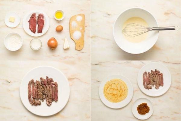 En la zona central de cada crepe pon una capa de ternera, las lonchas de brie encima y por último cebolla caramelizada para aportar el contraste sabroso y dulzón.