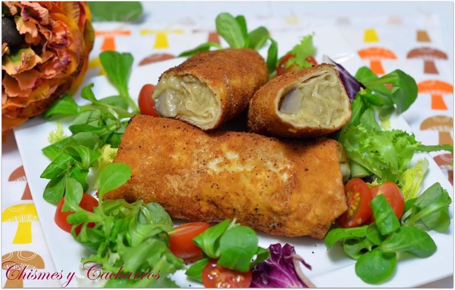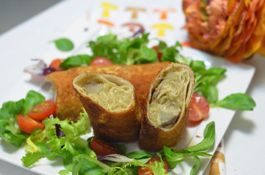 Coger las tortillas y poner en el medio un poco del relleno, plegar los bordes hacía adentro y luego enrollar. Pasar por el huevo batido y después por el pan rallado, freír en aceite bien caliente, hasta que se dore por los dos lados. Sacar y servir.
