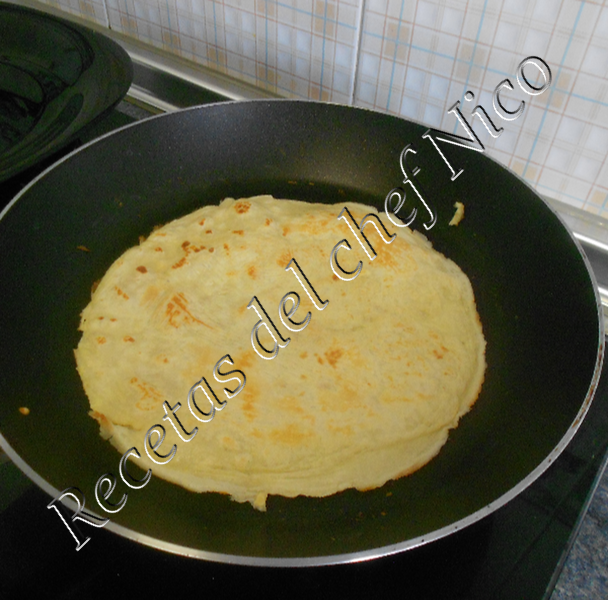 5.Después de unos 30 segundo, con una espátula vamos separando los bordes de la crepe pegados a la sartén y si al levantarla un poco, vemos que está con un color marroncito claro, le damos la vuelta y esperamos unos 20 segundo, después la sacamos. Esta operación (desde el punto 4 al 5) la repetimos hasta terminar con la masa.
