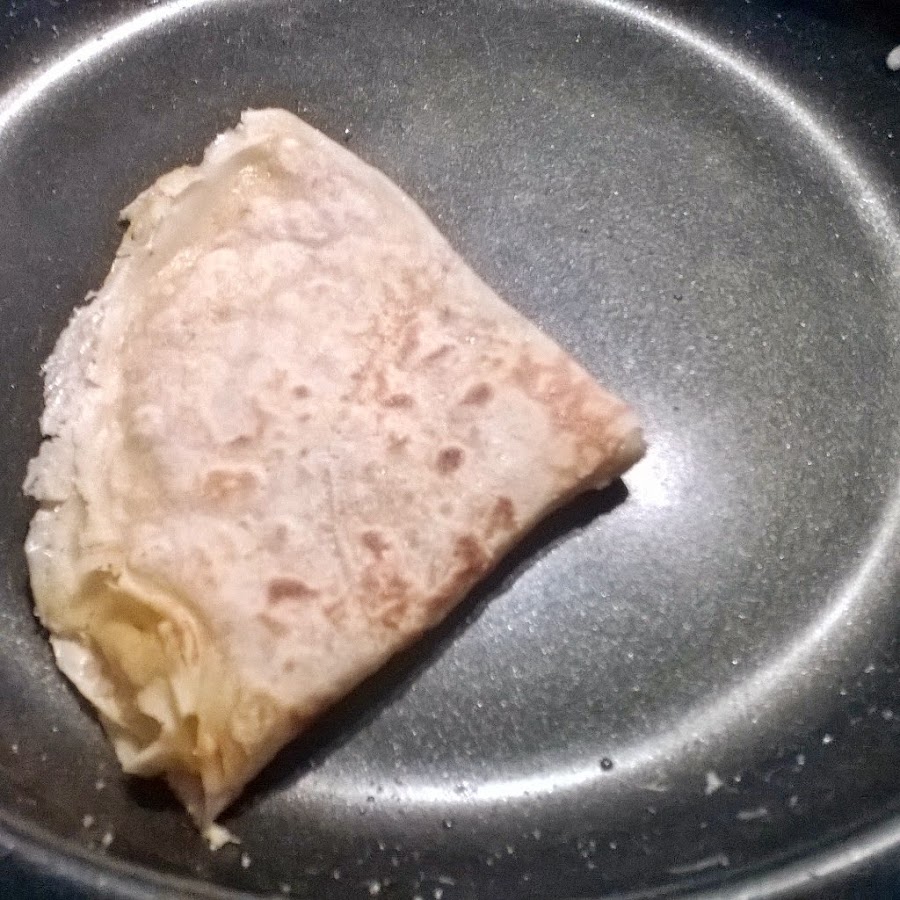 4. Apartamos la sartén del fuego y echamos un 1/4 de cazo en el centro. Rápidamente, movemos la sartén de tal manera que la masa se esparza para todos lados y cubra todo el diámetro de la sartén en una capa muy fina. El primero será de prueba y nos ayudará a estimar la cantidad exacta de que debemos echar. Si vemos que hay exceso de ella, la apartamos y la echamos junto al resto. Devolvemos la sartén al fuego y cocinamos 45-80 segundos, o hasta que los bordes del crep estén dorados y al mover la sartén el crep se mueva libremente. Le damos la vuelta con la punta utilizando la punta de los dedos o una espatula. (Los dedos son la herramienta con más precisión). Cocinamos el otro lado 15-30 segundos más justo hasta adquiera ligeras manchas marrones. Sacamos el crep a un plato.