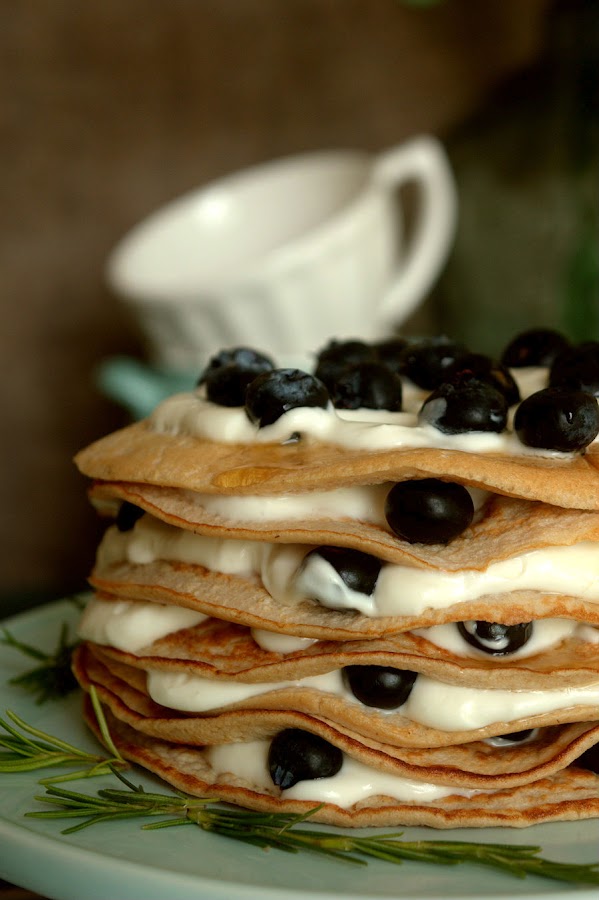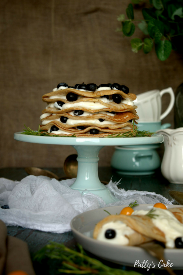 Estas crepes, tortitas o pancakes como quieras llamarlas solo llevan 4 ingredientes. Se hacen en un momento porque todos van a la batidora unos minutos y los vamos haciendo en la sartén, de uno en uno. Lo hice en una sartén de 18-20 cm. y salieron perfectos para hacer una linda tarta. Está rellena de arándanos y de una crema de queso en crema bajo en calorías y nata (crema de leche) (que puede ser vegetal y que a mí me encanta pero no tenía esta vez).