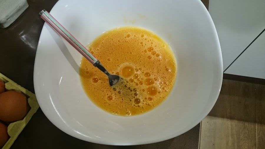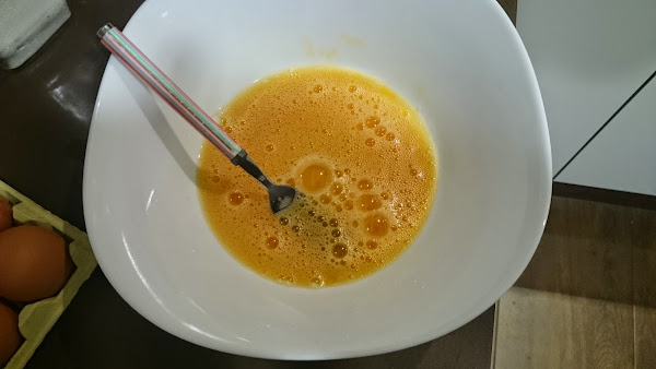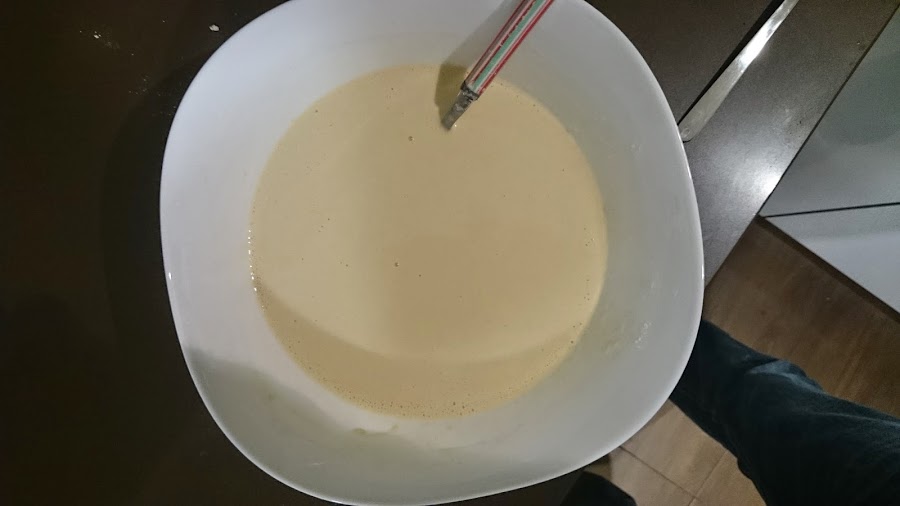 Primero haremos la masa, cogemos un bol y ponemos los huevos, los batimos bien como para hacer tortilla, seguidamente añadimos la sal y el azúcar y lo removemos para que se mezcle bien, ahora pondremos la harina y lo vamos mezclado, se irá poniendo duro, entonces añadimos la leche y mezclamos hasta obtener una masa semilíquida y sin grumos, (si veis que queda muy dura se puede añadir un poquito más de leche).
