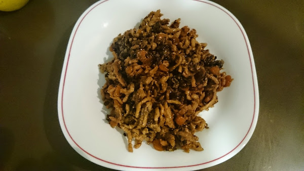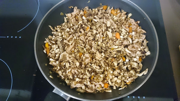 cuando esté más o menos cocinada la carne cogeremos los champiñones los lavamos, quitamos el tallo y procedemos a laminarlos y a hacerlos en trocitos muy pequeños y añadimos a la sartén con la cebolla, zanahoria y la carne y añadimos un chorrito considerable de salsa de soja y tapamos para que se cocine a fuego medio durante unos 15 min. aprox. iremos removiendo de vez en cuando.
