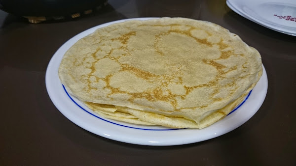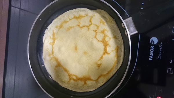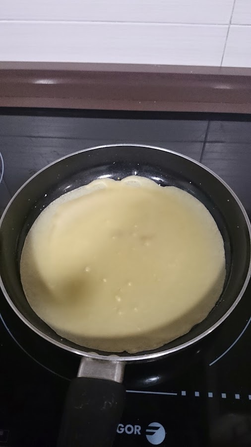 Mientras tanto procederemos a hacer los crepes, cogemos la masa que teníamos reservada la movemos con un tenedor, ponemos una sartén con una gotita de aceite y dejamos que se caliente bien, movemos la sartén para que se reparta la gotita de aceite por la base, y con un cucharón vertemos más o menos el cucharon lleno sobre la sartén y movemos la sartén de un lado a otro para que se reparta la mezcla por toda la base de la sartén y dejamos que se haga durante unos 2 min. a fuego medio, veréis que se despega fácilmente y que se dora entonces procedemos a darle la vuelta con una espátula, y la misma operación para ambas partes del crepe (2 min.), y así hasta que acabemos la masa, a cada 2 crepes que hagamos pondremos una gotita de aceite en la sartén para que no se nos peguen, una vez acabada la masa y con los crepes obtenidos, serviremos el relleno en una fuente y los crepes en un plato, y la procederán cada uno a rellenar su propio crepes con una cuchara esparcimos el relleno por todo el crepe y enrollamos , y nada ya tenemos unos crepes deliciosos, espero que os gusten, buen provecho