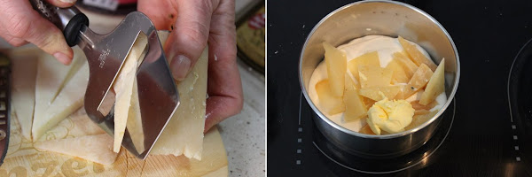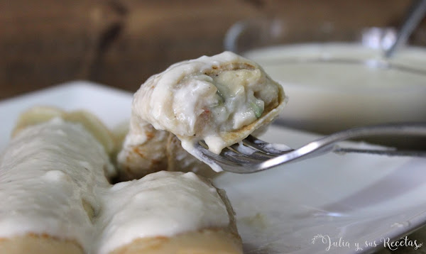 Hacemos las crèpes como dice la receta y las reservamos. Ver aquíHacemos las salsa de queso poniendo en un cazo la nata (crema de leche), la mantequilla y el queso en lascas, lo llevamos a fuego medio hasta que se derrita el queso , le ponemos sal y pimienta al gusto y la reservamos.