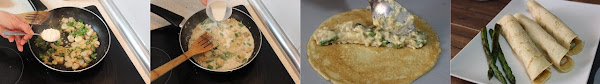 Hoy os dejo unas crêpes saladas, rellenas de gambas y espárragos que acompañadas de una rica salsa de queso hace que sean deliciosas.