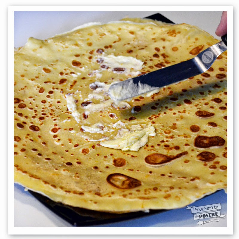 5. Extiende un poco de la mezcla de mantequilla que habías preparado antes en el interior de los crêpes.