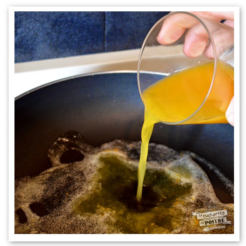 8. Añade un chorrito de zumo de naranja y deja que reduzca hasta tener la textura de un sirope.