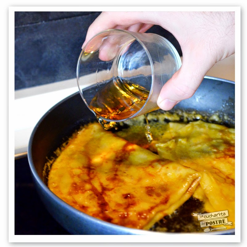 10. Vierte un chorrito de licor de naranja y flambéalos con un encendedor o una cerilla. Lleva cuidado y nunca lo hagas con el extractor de humos encendido para que la llamarada no te queme la cocina. No quiero que luego me pidas responsabilidades si se te incendia la casa.